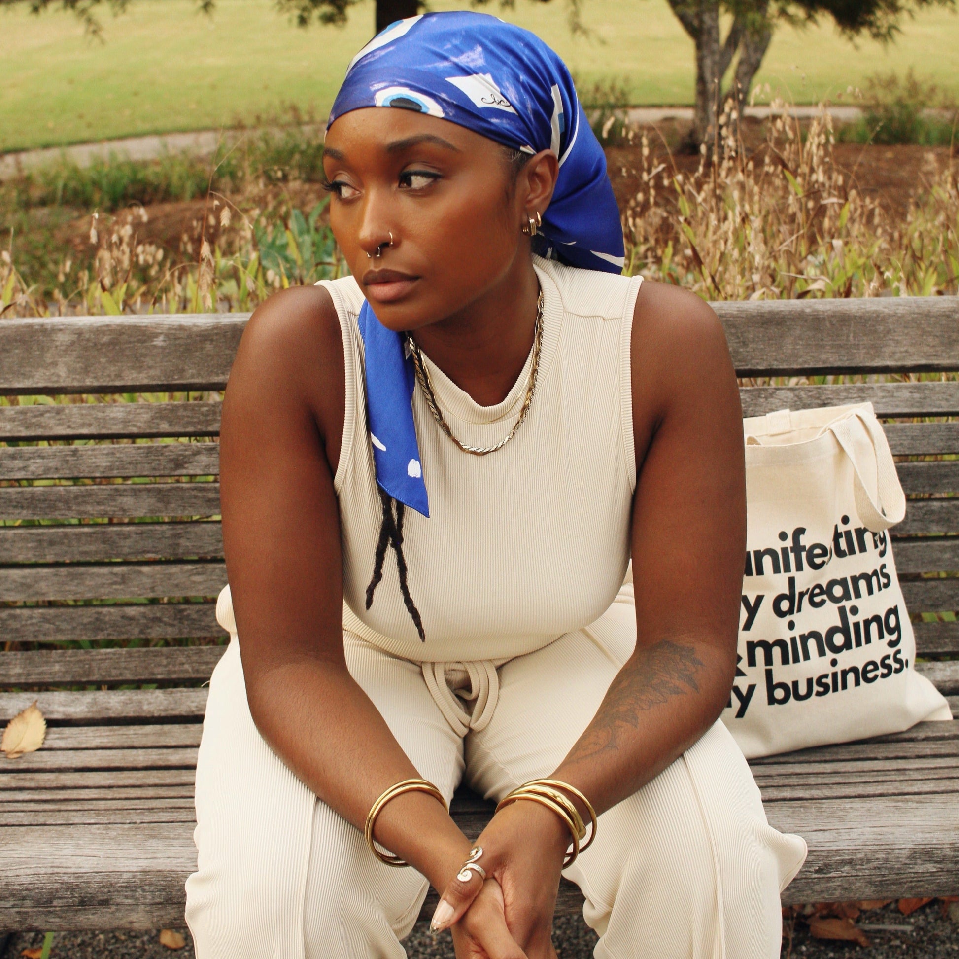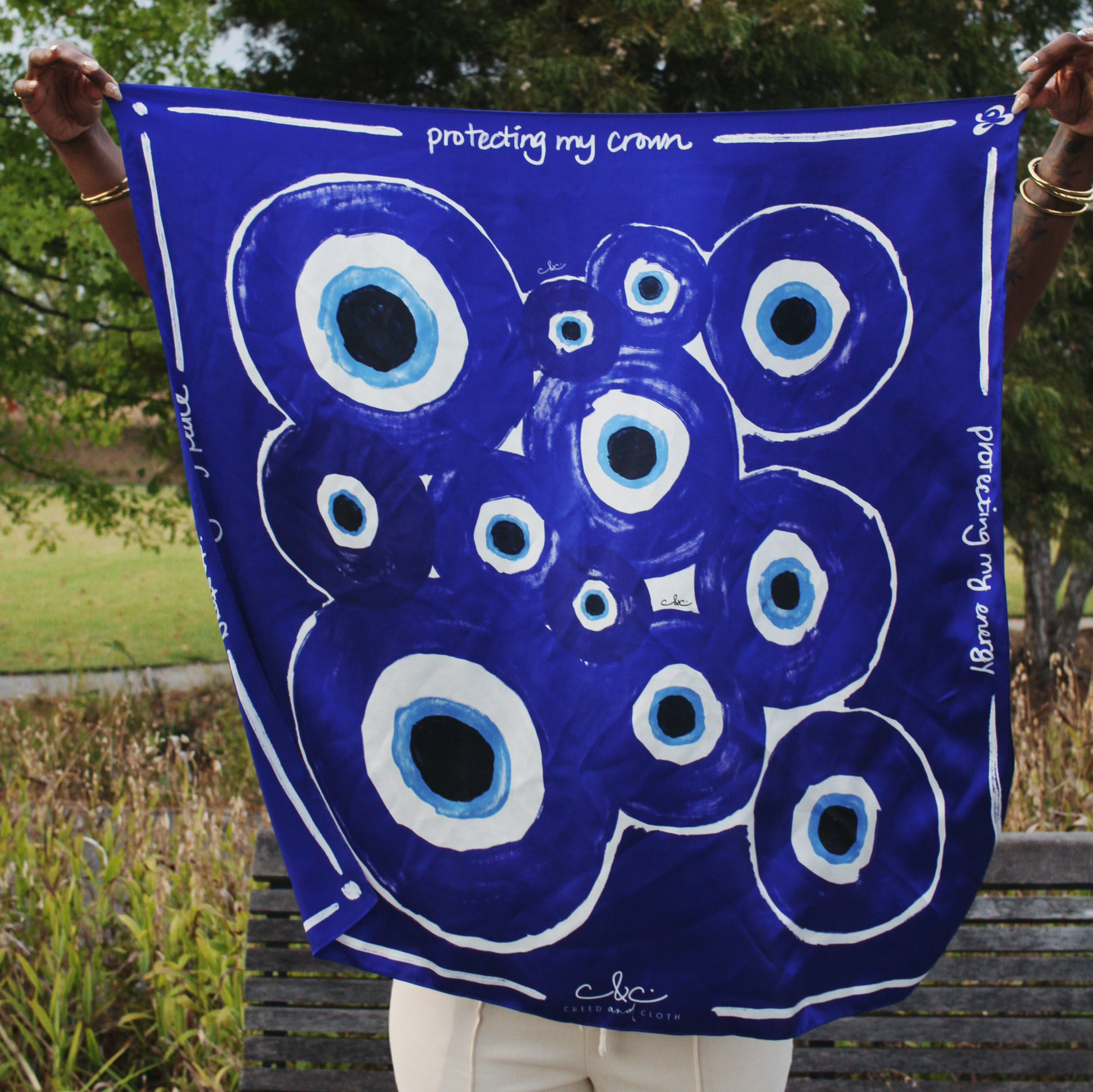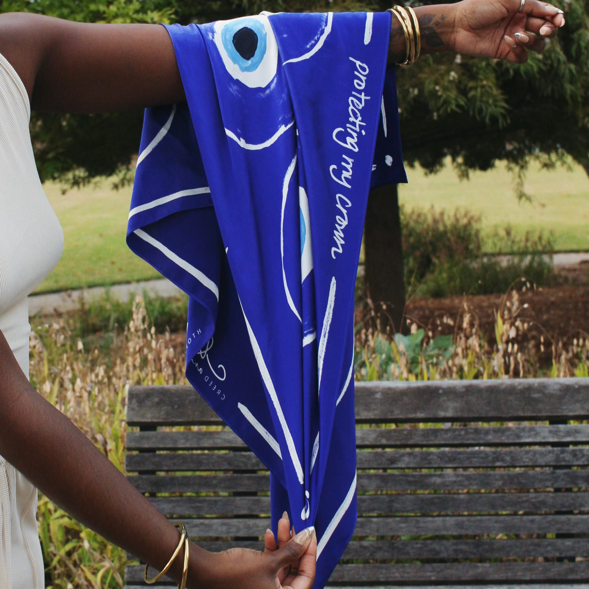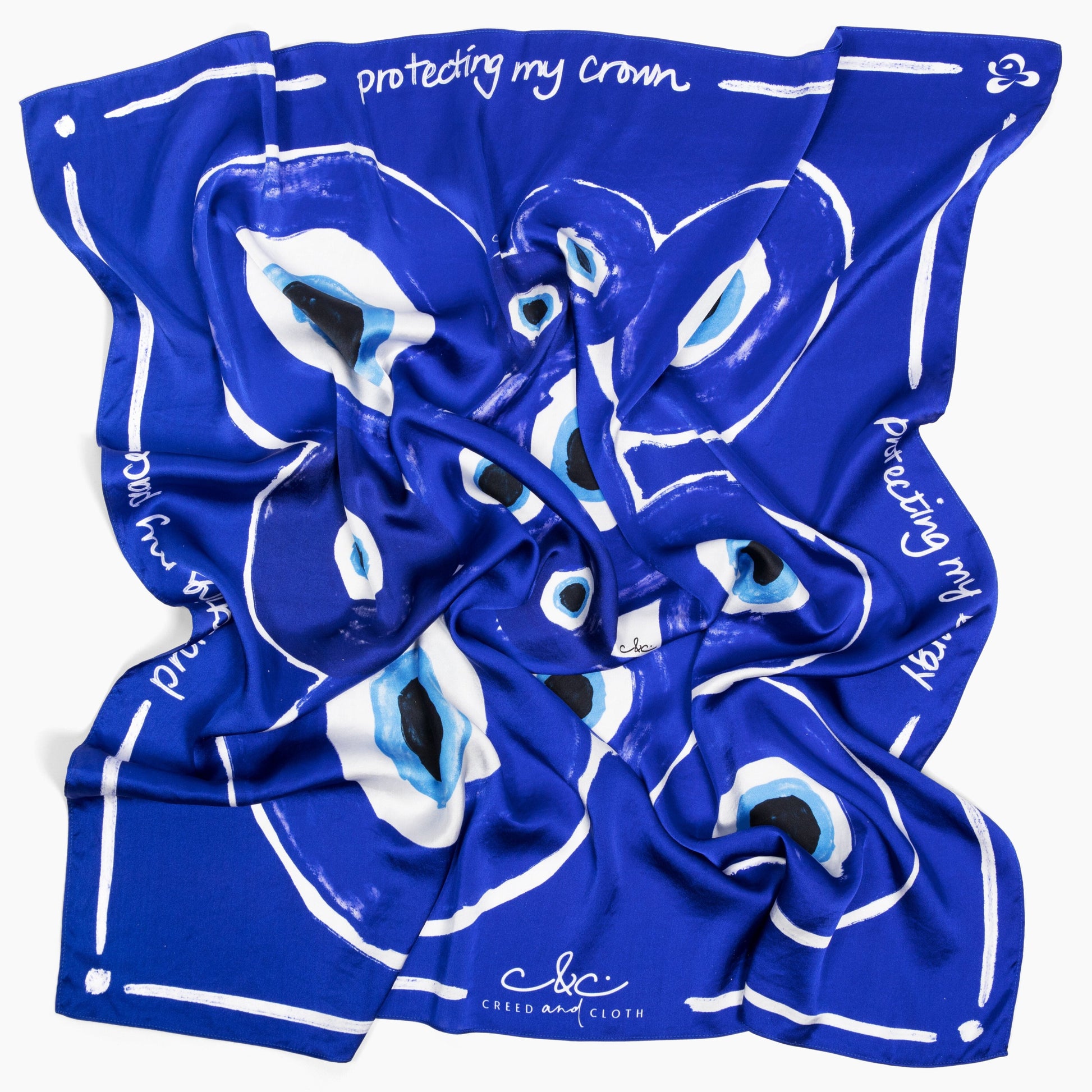 The Evil Eye scarf in vibrant lapis luxe is designed for those who seek to carry a daily reminder of divine protection and the importance of safeguarding their crown, peace, and energy, as acts of self-care. Imprinted with the mantra “protecting my crown, protecting my peace, protecting my energy,” this scarf serves as both an affirmation and an intentional layer of protection.
